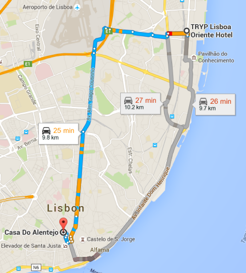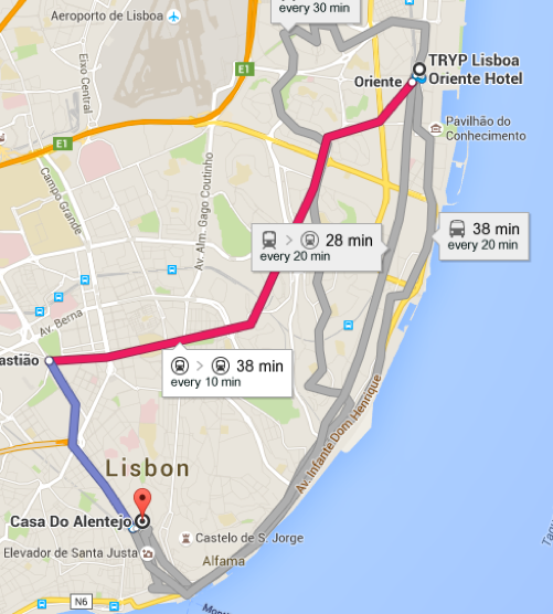 It is a 20 min trip (walk and metro) from the FIL Congress Center. The student volunteers will guide you towards the Casa do Alentejo.